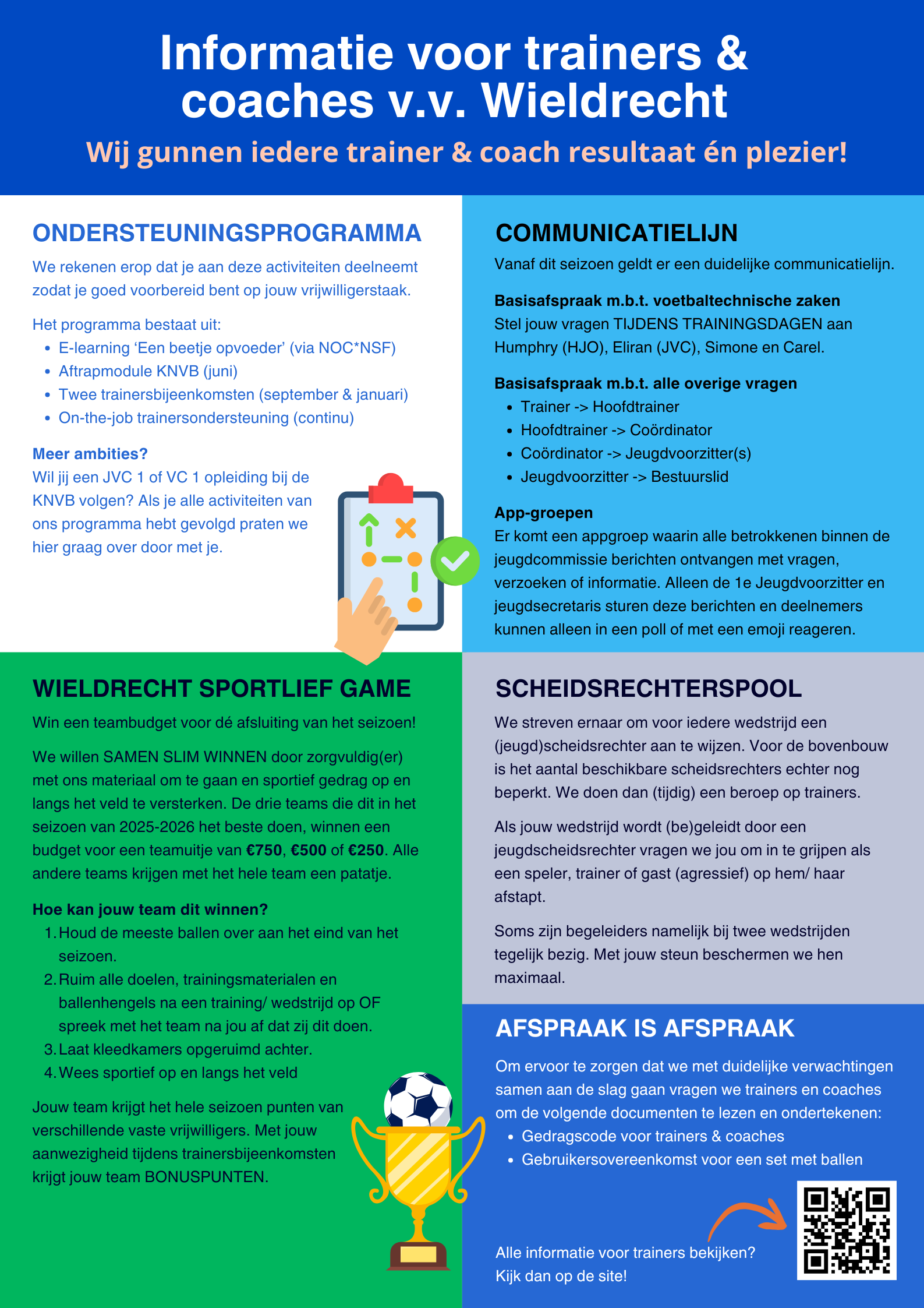 We willen SAMEN SLIM WINNEN door zorgvuldig(er) met ons materiaal om te gaan en sportief gedrag op en langs het veld te versterken. De drie teams die dit in het seizoen van 2025-2026 het beste doen, winnen een budget voor een teamuitje van €750, €500 of €250. Alle andere teams krijgen met het hele team een patatje.