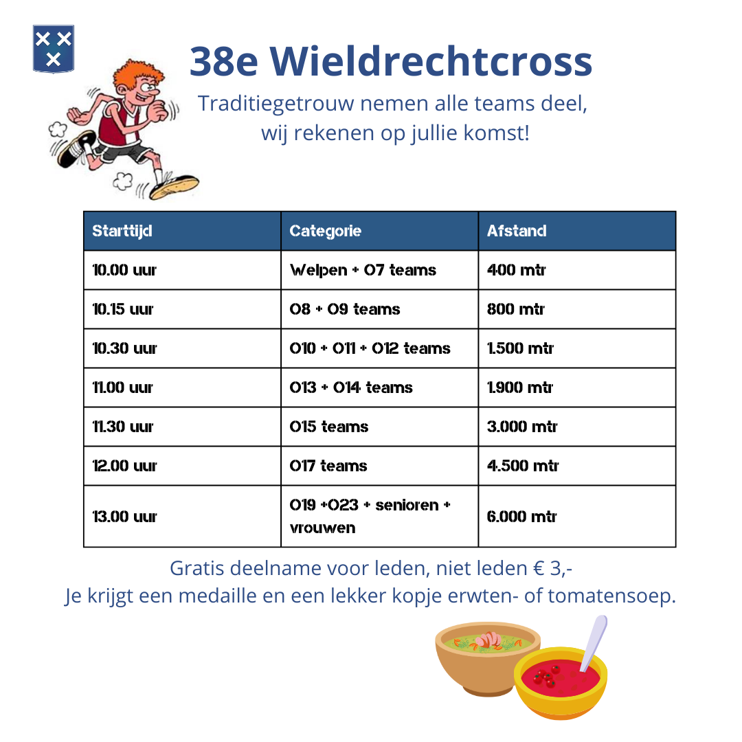 Op zaterdag 4 januari ’25 starten we het voetbalseizoen zoals ieder jaar met de Wieldrechtcross. We rekenen erop dat alle teams op de aangegeven tijd met hun afstand starten om daarna samen te genieten van een warme kop soep.
